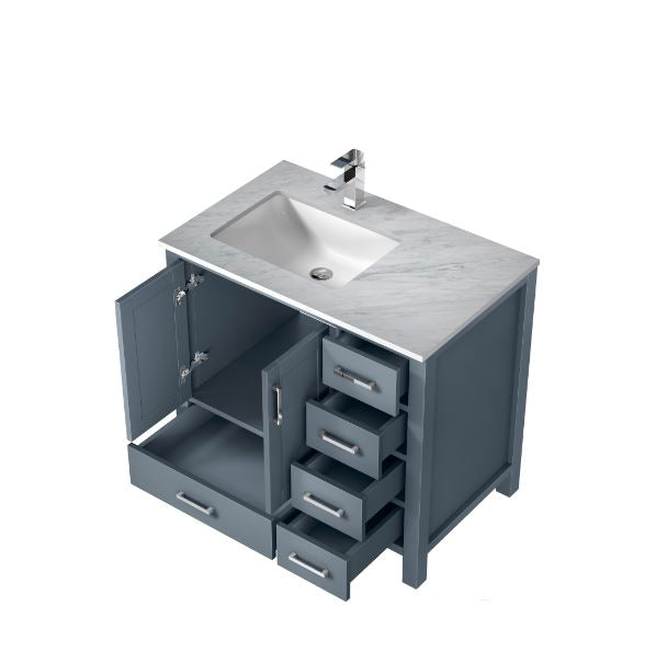 Lexora Jacques 36" Dark Grey Single Vanity, White Carrara Marble Top, White Square Sink and no Mirror - Left Version LJ342236SBDS000-L