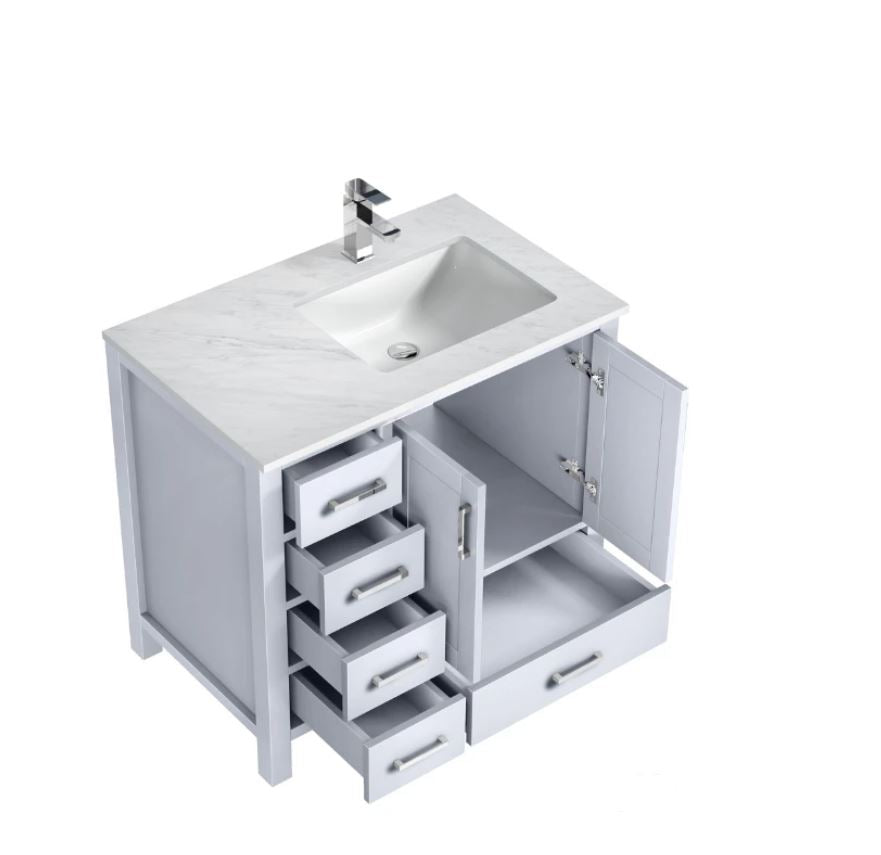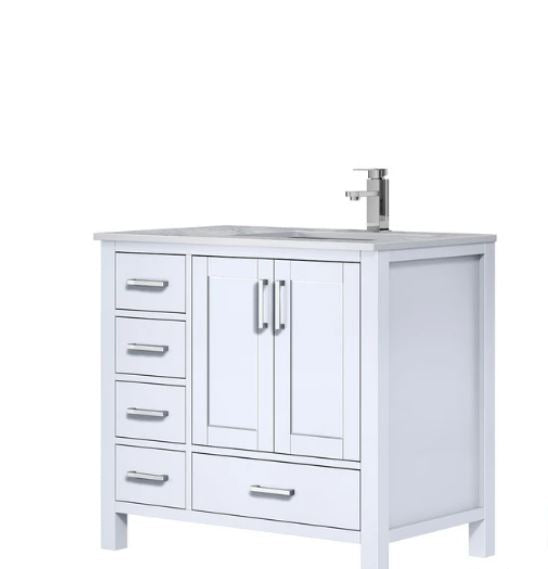 Lexora Jacques 36" White Single Vanity, Carrara Marble Top, White Square Sink and no Mirror - Right Version LJ342236SADS000-R