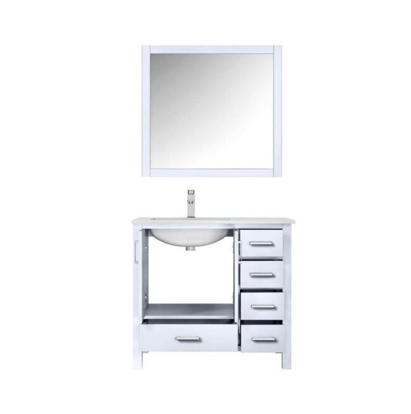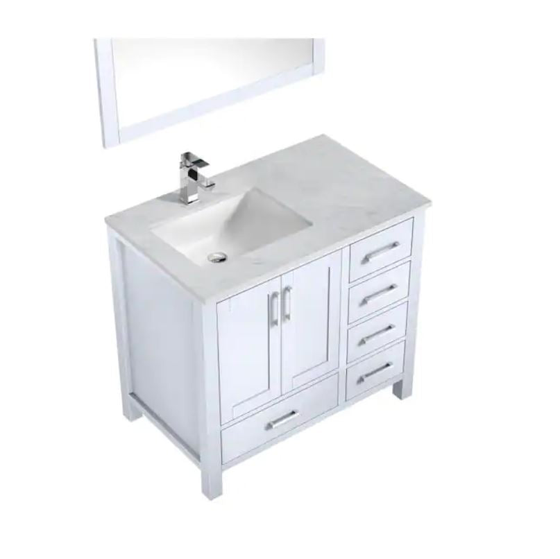 Lexora Jacques 36" White Single Vanity, White Carrara Marble Top, White Square Sink and 34" Mirror - Left Version LJ342236SADSM34-L
