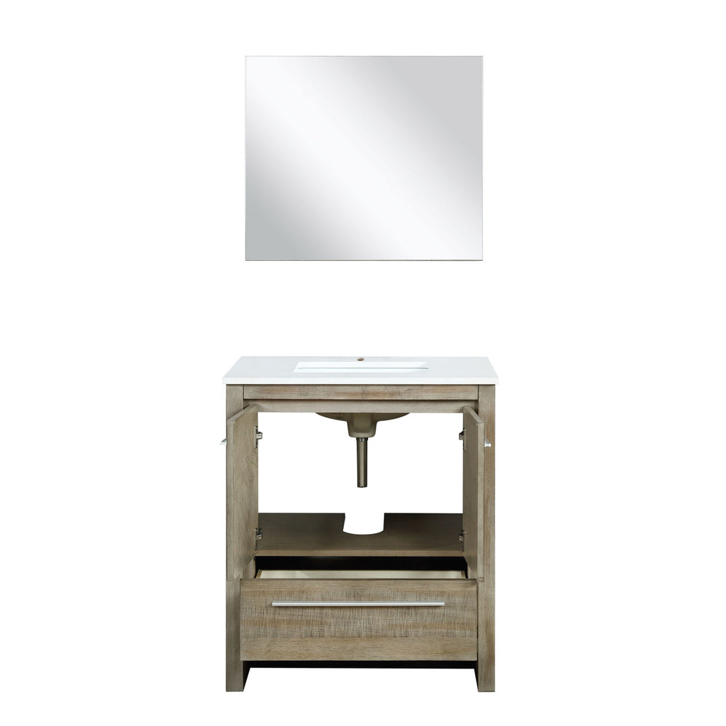 Lexora Lafarre 30" Rustic Acacia Bathroom Vanity, White Quartz Top, White Square Sink, and 28" Frameless Mirror LLF30SKSOSM28