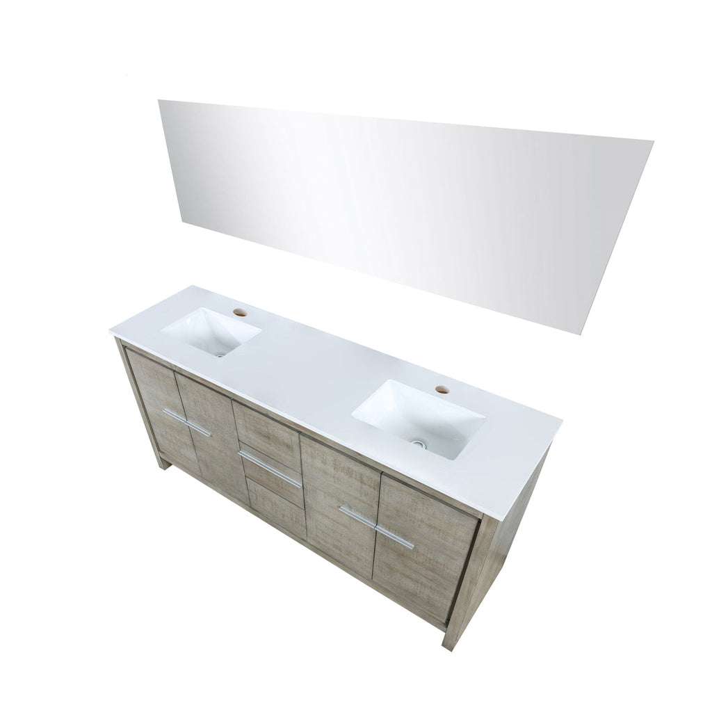 Lexora Lafarre 72" Rustic Acacia Double Bathroom Vanity, White Quartz Top, White Square Sinks, and 70" Frameless Mirror LLF72DKSODM70