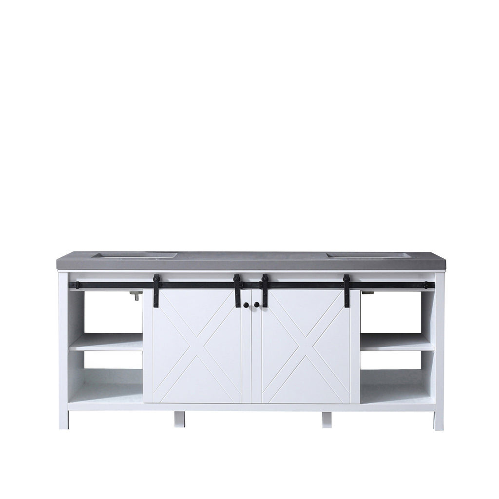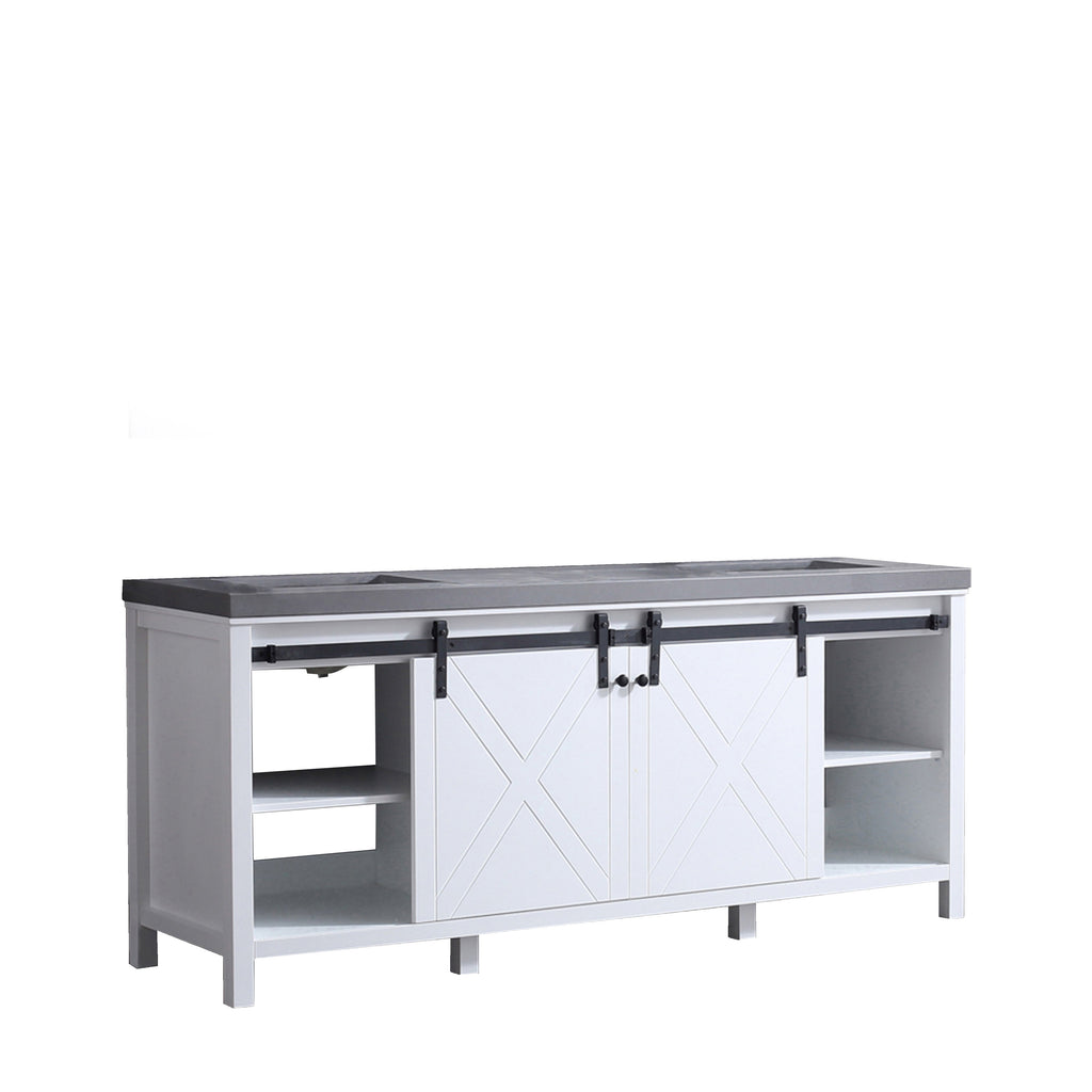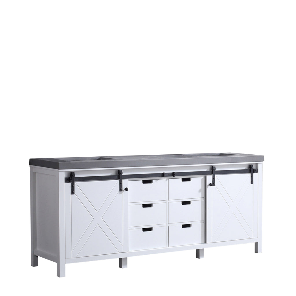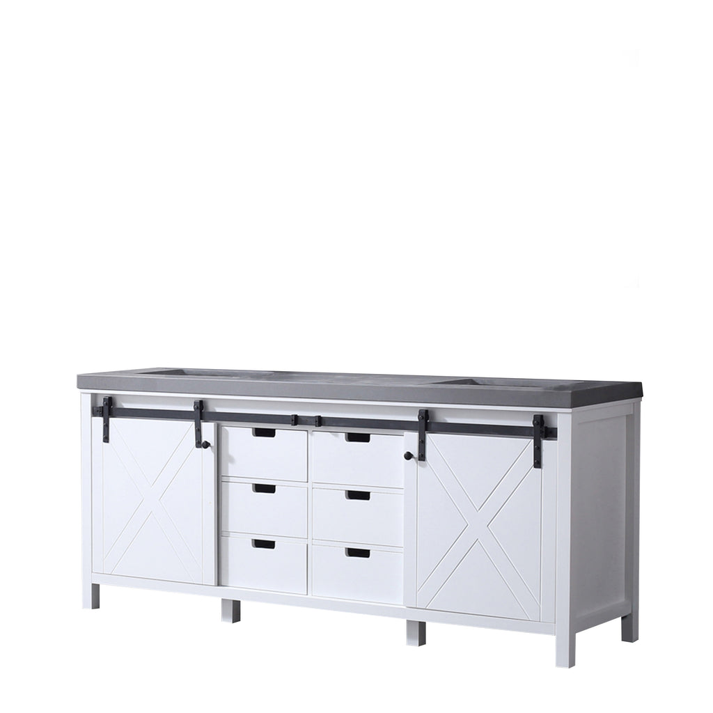 The Marsyas vanity in white features a unique blending of modern style with rustic design elements to create a piece that makes a beautiful addition to any bathroom. The smooth, modern lines and cool-toned finish are paired with a matching countertop of solid stone. But the sliding, barn-style cabinet doors give this vanity a truly unique touch. Constructed of solid birch and rubber wood, with superior moisture resistance, this piece's style is only matched by its dependability. With included sinks, the Marsyas vanity is the perfect set for finishing off your bathroom remodel.