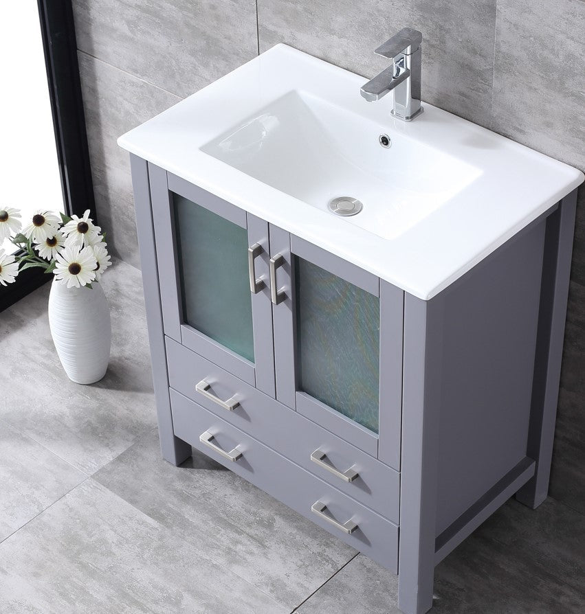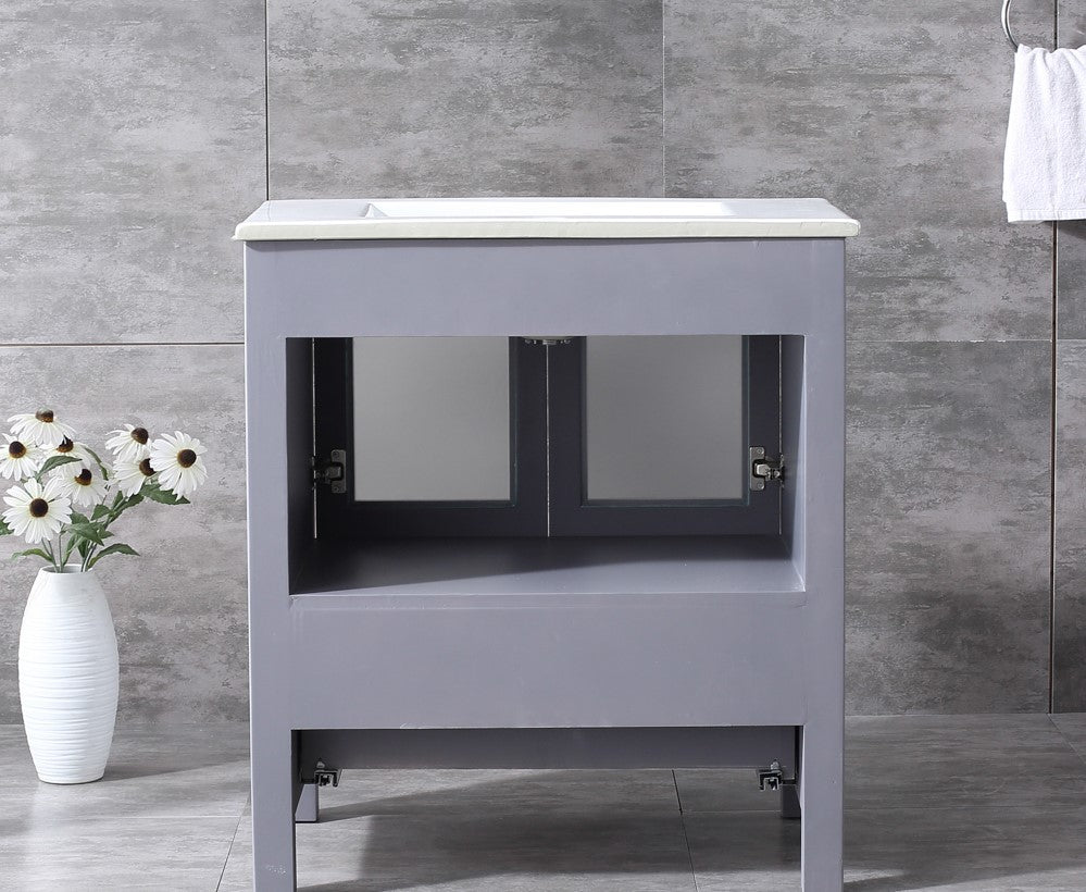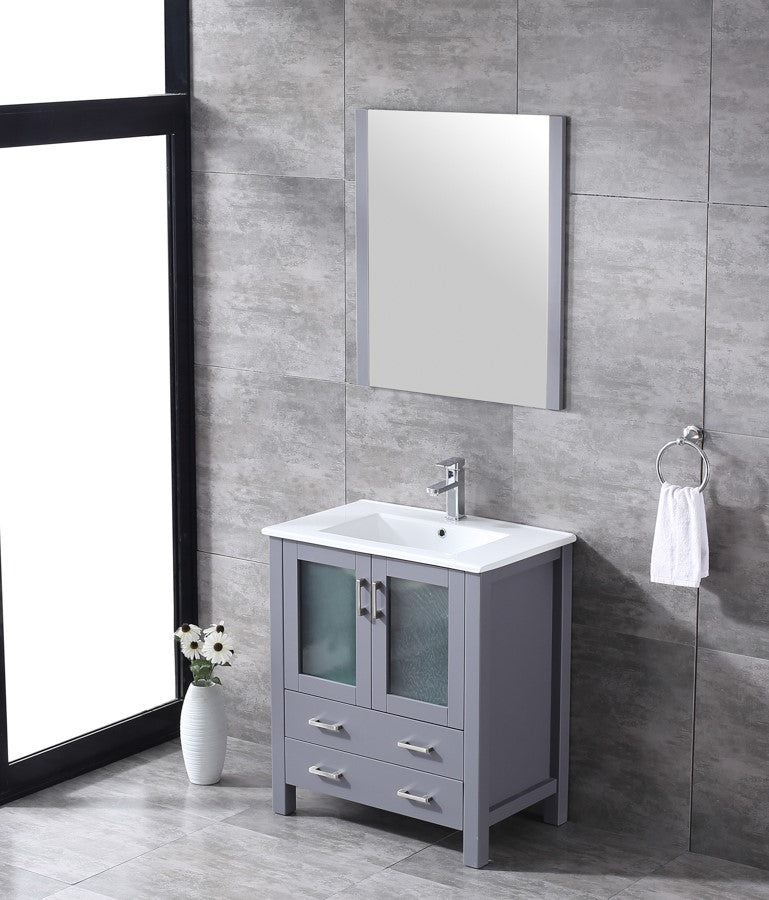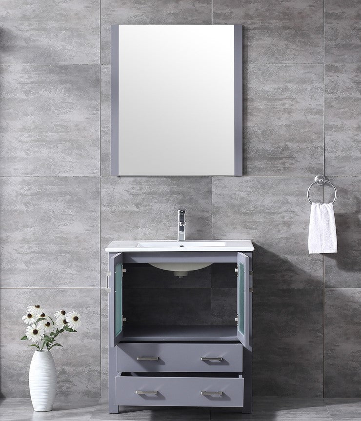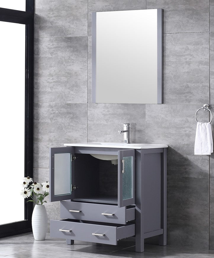 Lexora Volez 30" Dark Grey Single Vanity, Integrated Top, White Integrated Square Sink and 28" Mirror LV341830SBESM28