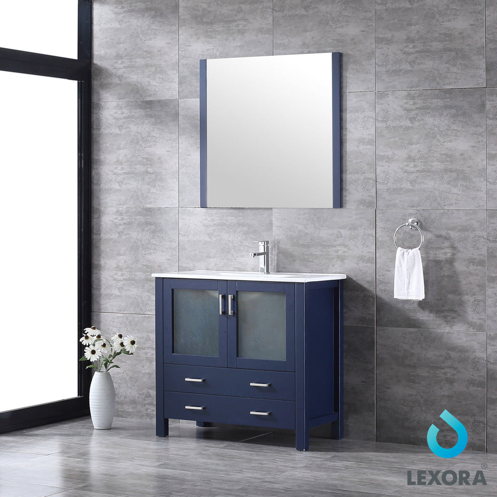 Lexora  Volez 36" Navy Blue Single Vanity, Integrated Top, White Integrated Square Sink and 34" Mirror LV341836SEESM34