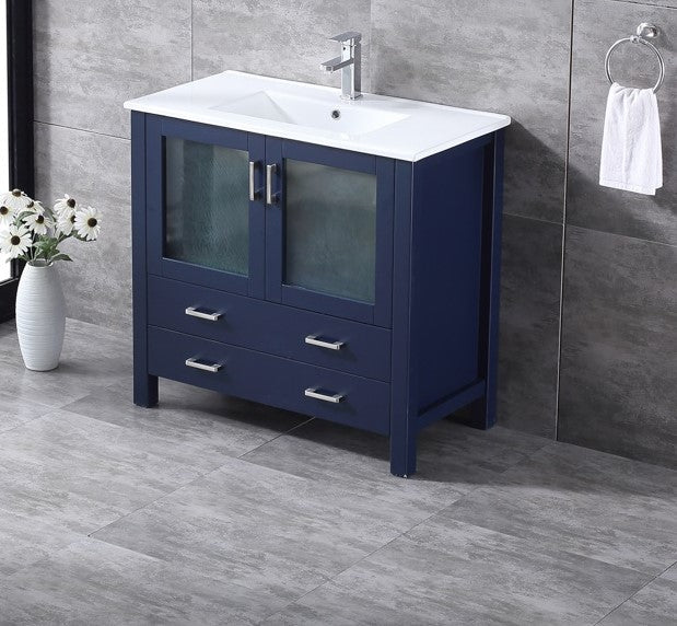 Lexora Volez 36" Navy Blue Single Vanity, Integrated Top, White Integrated Square Sink and no Mirror LV341836SEES000