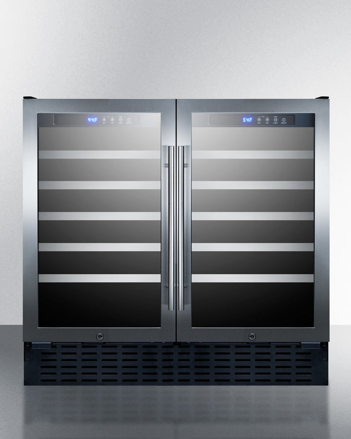 The SWC3668 is a 36" wide wine cellar designed for built-in installation under counters. The fully finished black cabinet also allows freestanding use. This unit includes two seamless stainless steel trimmed glass doors with a unique French door swing. Both include factory installed locks for added security and professional handles to finish the modern look.