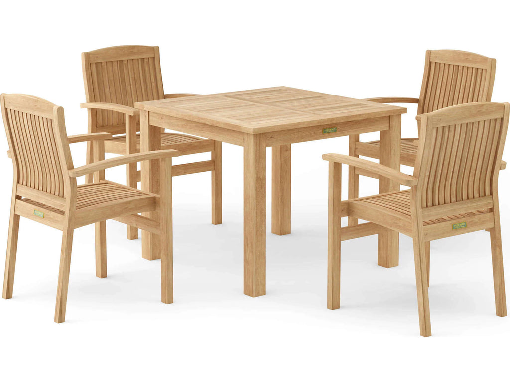 Enjoy the beauty of your backyard and the pleasure of outdoor dining with the Bahama Dining Table and Sahara Stacking Armchairs. This set includes a 35″ Bistro Square Table that fits four people comfortably with four Sahara Stacking Armchairs featuring contoured back and seating for added comfort. Table is constructed using mortise and tenon joinery for strength and durability while the stacking chairs arrive fully assembled. Made of premium grade unfinished teak this set will provide decades of dining enjoyment with family and friends.