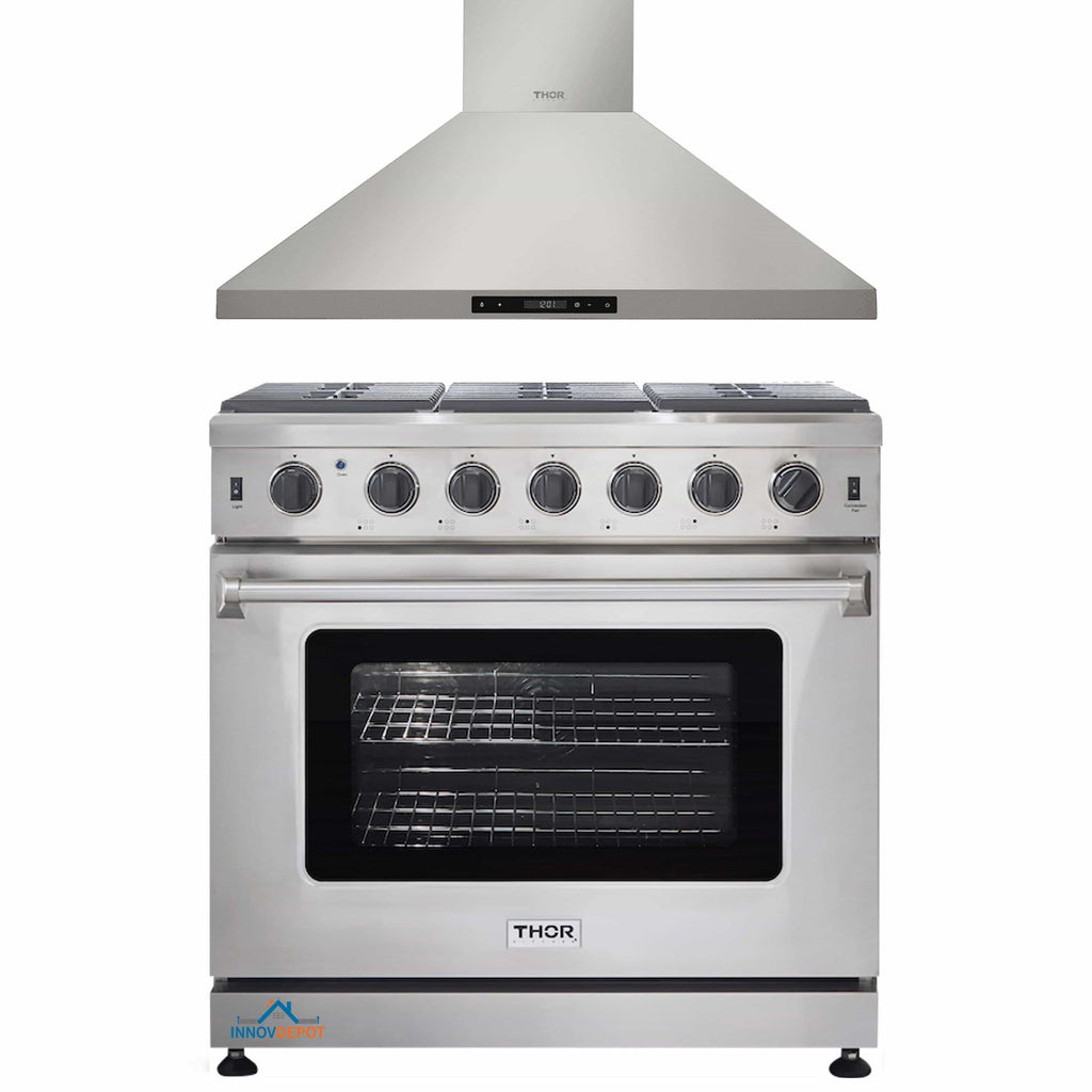 Thor Kitchen 2-Piece Appliance Package - 36-Inch Gas Range & Premium Wall Mount Hood in Stainless Steel