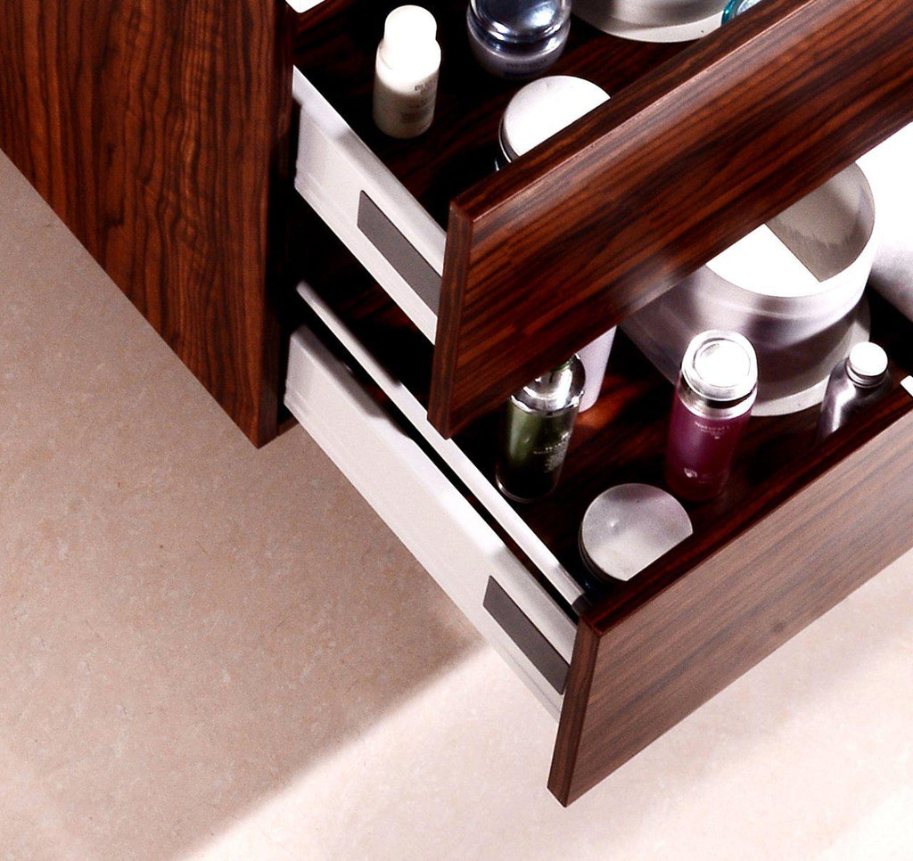 The Bliss is one of the most elegant modern Bathroom Vanities around. This 24 Inch model comes with a reinforced Acrylic sink, Marine Wood Veneer Constructed Console that is fully moister and water proof, with high quality European Hardware, that provides smooth soft-closing operation drawers.