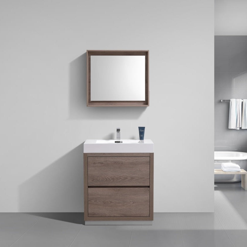 The Bliss is one of the most elegant modern Bathroom Vanities around.  This 30-inch model comes with a reinforced Acrylic composite sink, Marine Veneer Wood Constructed Console that is fully moisture and waterproof, with high-quality European  Hardware that provides easy click, Push-Open drawers.