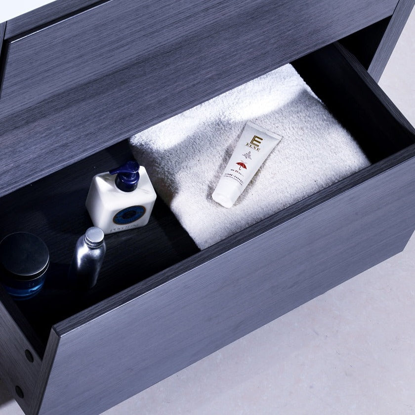 The Bliss is one of the most elegant modern Bathroom Vanities around.  This 30-inch model comes with a reinforced Acrylic composite sink, Marine Veneer Wood Constructed Console that is fully moisture and waterproof, with high-quality European  Hardware that provides easy click, Push-Open drawers.