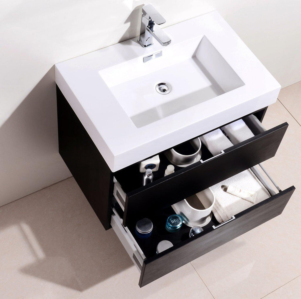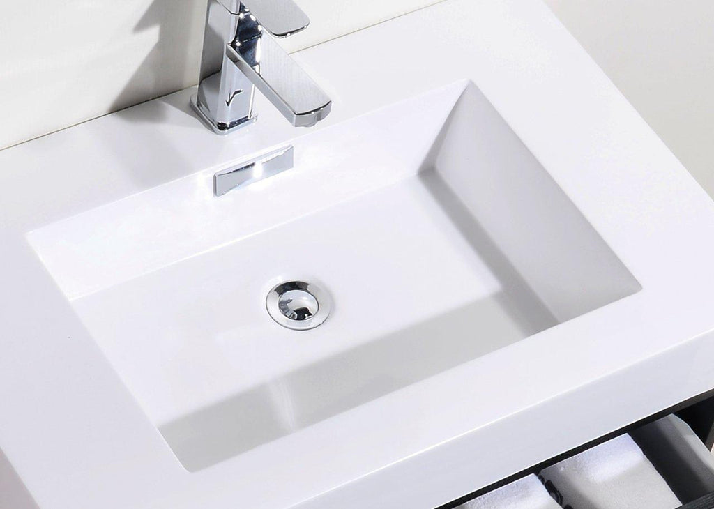 The Bliss is one of the most elegant modern Bathroom Vanities around. This 30 Inch model comes with a reinforced Acrylic sink, Marine Wood Veneer Constructed Console that is fully moister and water proof, with high quality European DTC Hardware, that provides smooth soft-closing operation drawers.