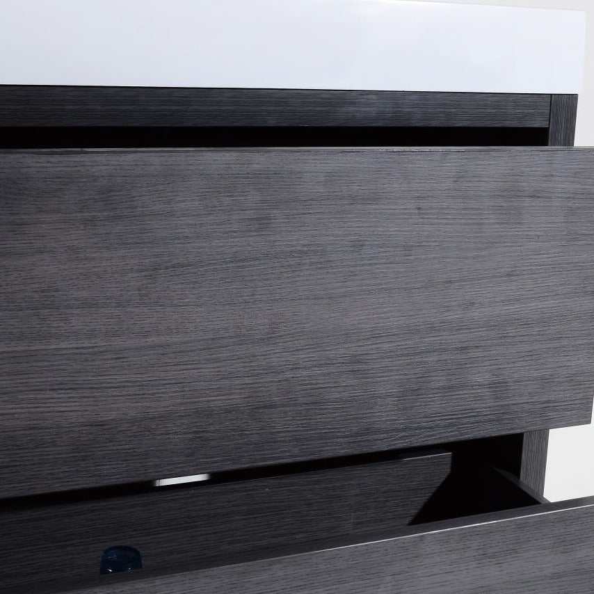 The Bliss is one of the most elegant modern Bathroom Vanities around.  This 36-inch model comes with a reinforced Acrylic composite sink, Marine Veneer Constructed Console that is fully moisture and waterproof, with high-quality European  Hardware that provides easy click, Push-Open drawers.