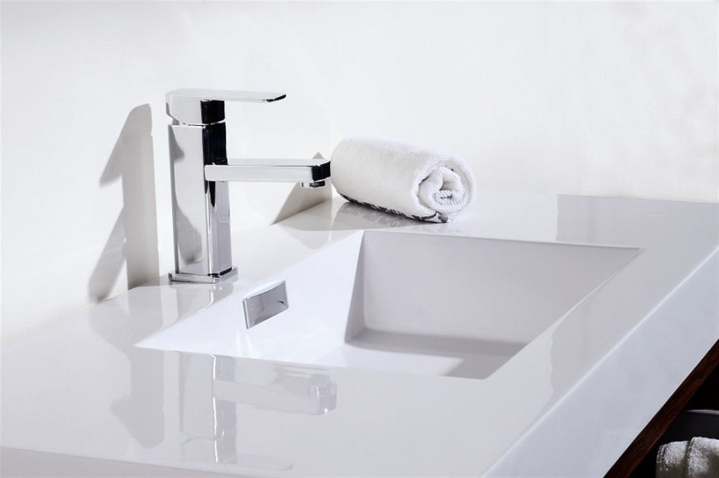 The Bliss is one of the most elegant modern Bathroom Vanities around.  This 40-inch model comes with a reinforced Acrylic sink, Marine Veneer Constructed Console that is fully Moisture and Waterproof, with high-quality European Hardware, that provides smooth soft-closing operation on two fully functional drawers.