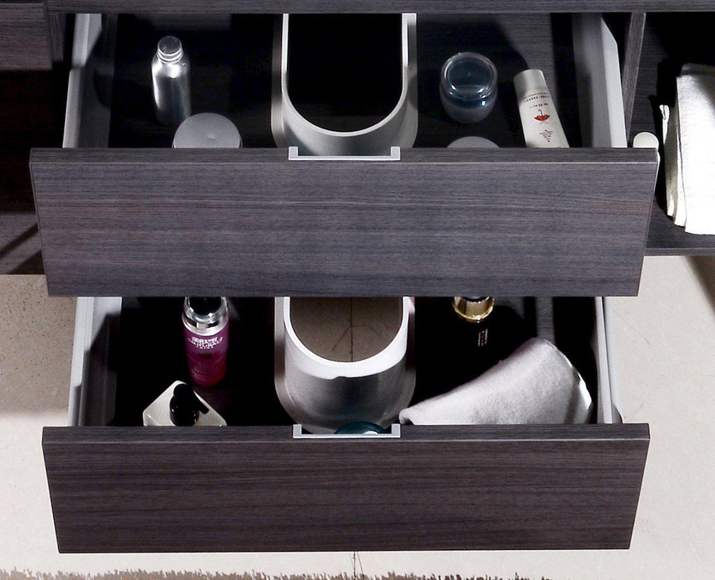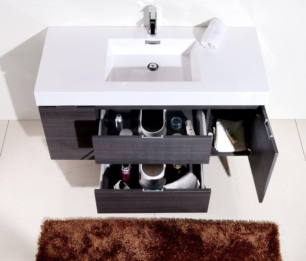The Bliss is one of the most elegant modern Bathroom Vanities around. This 48 Inch model comes with a reinforced Acrylic sink, Marine Wood Veneer Constructed Console that is fully moister and water proof, with high quality European DTC Hardware, that provides smooth soft-closing operation drawers.