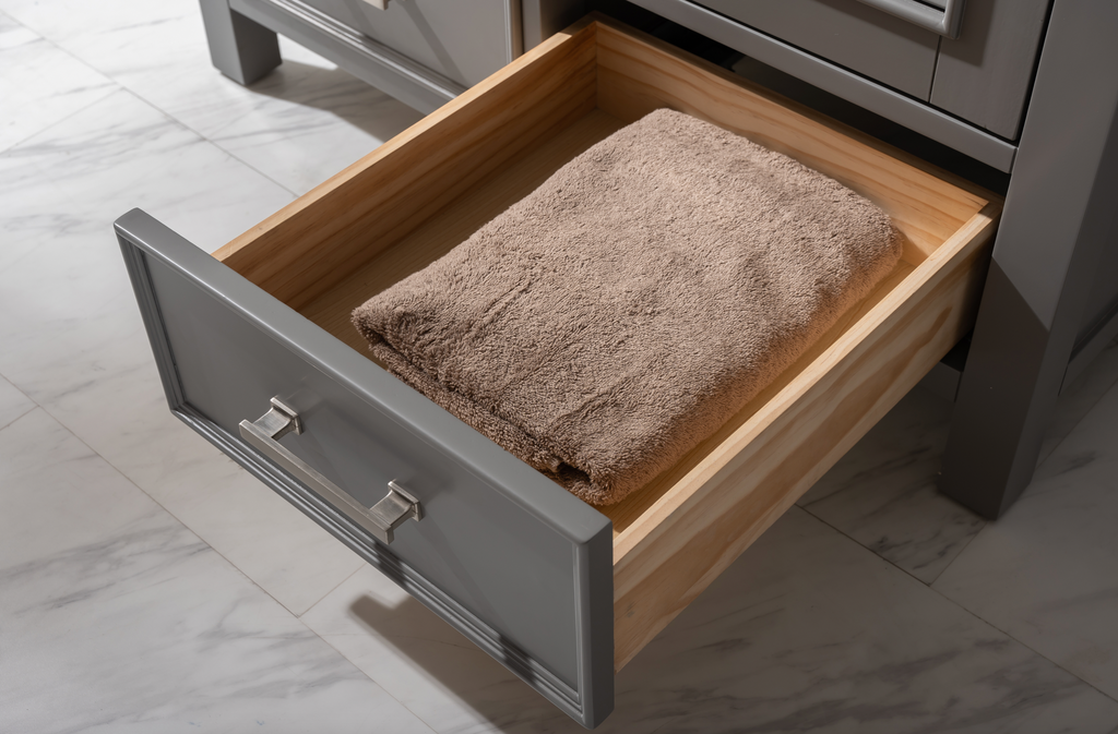 All Estate vanity cabinets are constructed from solid birch hardwood and paired with a 1 inch thick seamless quatz countertop and backsplash. Soft closing doors and drawers provide smooth and quiet operations, while brushed finished metal hardwares provides the perfect finishing touch. Other fine details include a white porcelain sink with overflow, dovetail joint drawer construction, predrilled holes to accommodate 8-inch widespread faucets, and multi-layer paint finish on the cabinets provide beauty and durability for years to come.