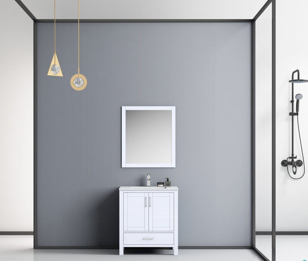 Lexora Jacques 30" White Single Vanity White, no Top and 28" Mirror LJ342230SA00M28