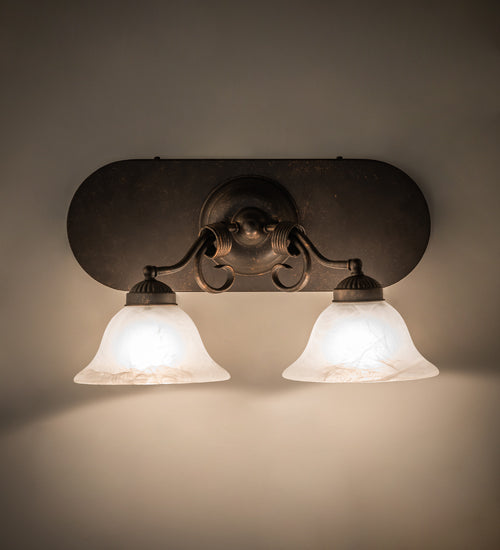 An exquisite lighting design, this twin shade luminaire features stunning Faux Alabaster glass, which is complemented with scroll designed hardware in a Gilded Tobacco finish. The wall fixture, which is handcrafted by highly skilled artisans at our 180,000 square foot manufacturing facility in Yorkville, New York, can be used as a vanity in baths or as a sconce in corridors. Custom colors, sizes, styles and dimmable energy efficient lamping options are available. UL and cUL listed for damp and dry locations.