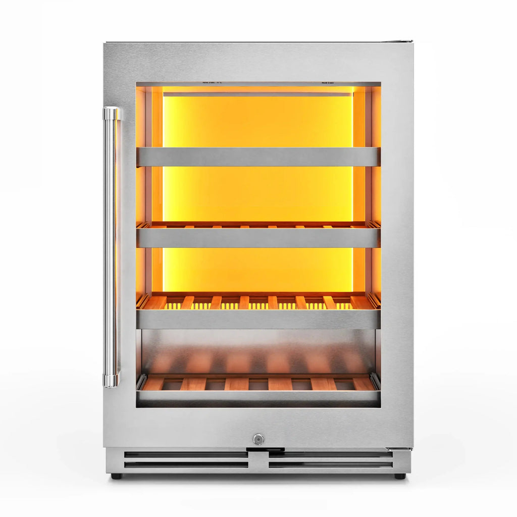 Thor Kitchen 24-Inch Wine Cooler with Backlight in Stainless Steel holds up to 45 Bordeaux bottles for maximum storage. The Amber LED interior light reduces heat transmission.