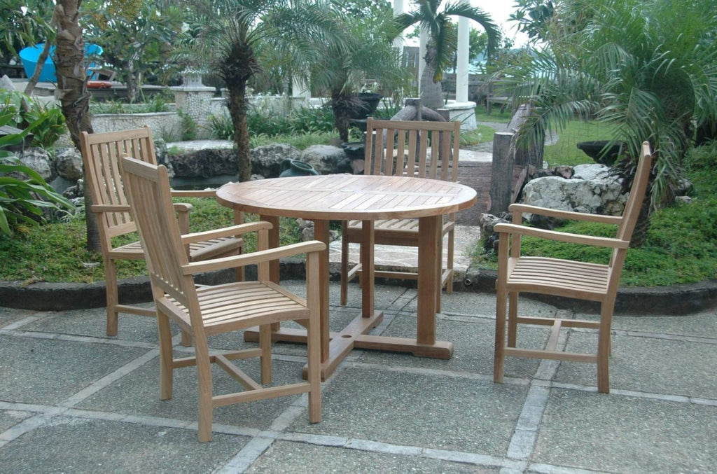 This traditional-style Tosca dining set has an ideal design for dining and relaxing in your garden. These simple and classic armchairs have contoured seats on it that add support and comfort. The solid construction and beautiful, traditional design will surely provide your family with many years of outdoor recreation. This intimate dining set comes with 1 47" Tosca Round Table and 4 Wilshire Dining Armchairs.