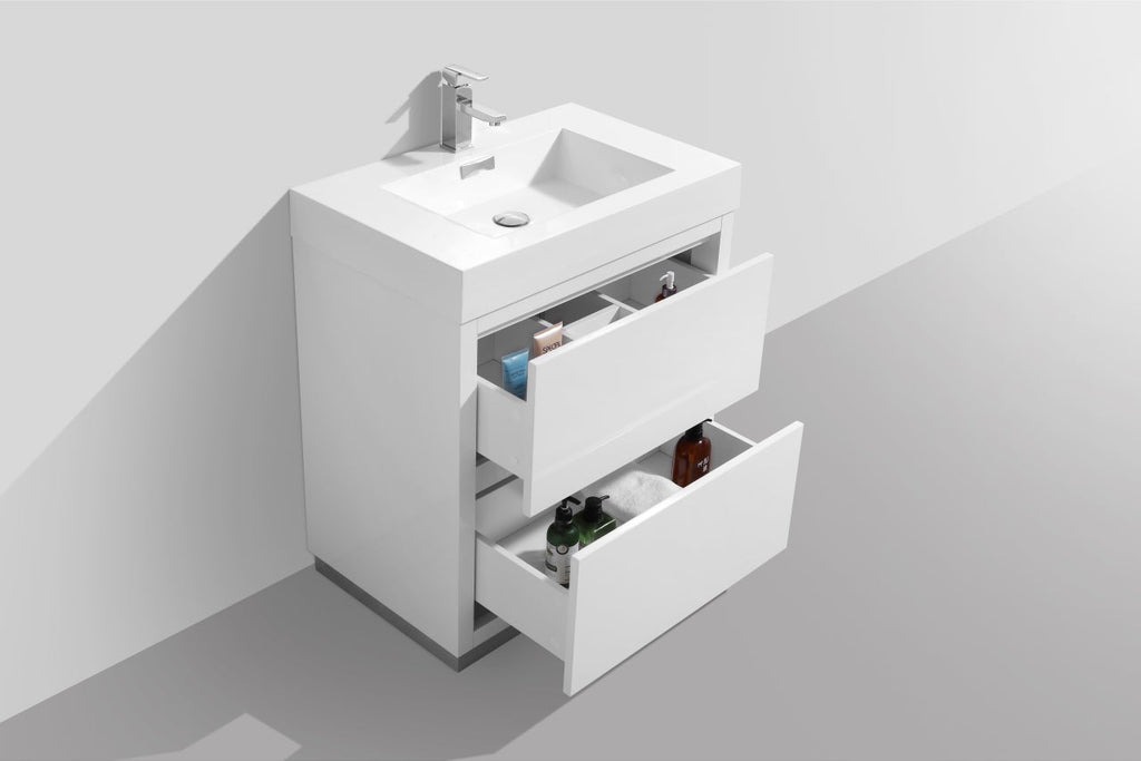 The Bliss is one of the most elegant modern Bathroom Vanities around.  This 30-inch model comes with a reinforced Acrylic composite sink, MDF Wood Constructed Console, white Lacquer high gloss paint finish, with high-quality European  Hardware that provides easy click, Push-Open drawers.