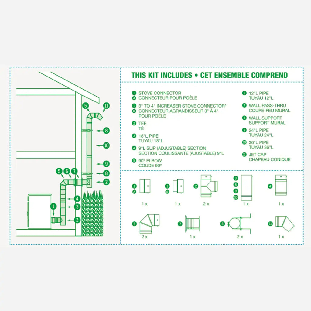 Includes: one stove connector, one 3" to 4" increaser stove connector, one 12"L pipe, one 18"L pipe, one 24"L pipe, two 36"L pipe, one 9"L slip adjustable section, one wall pass-thru, two tees, two 90° elbows, two wall supports and one jet cap.