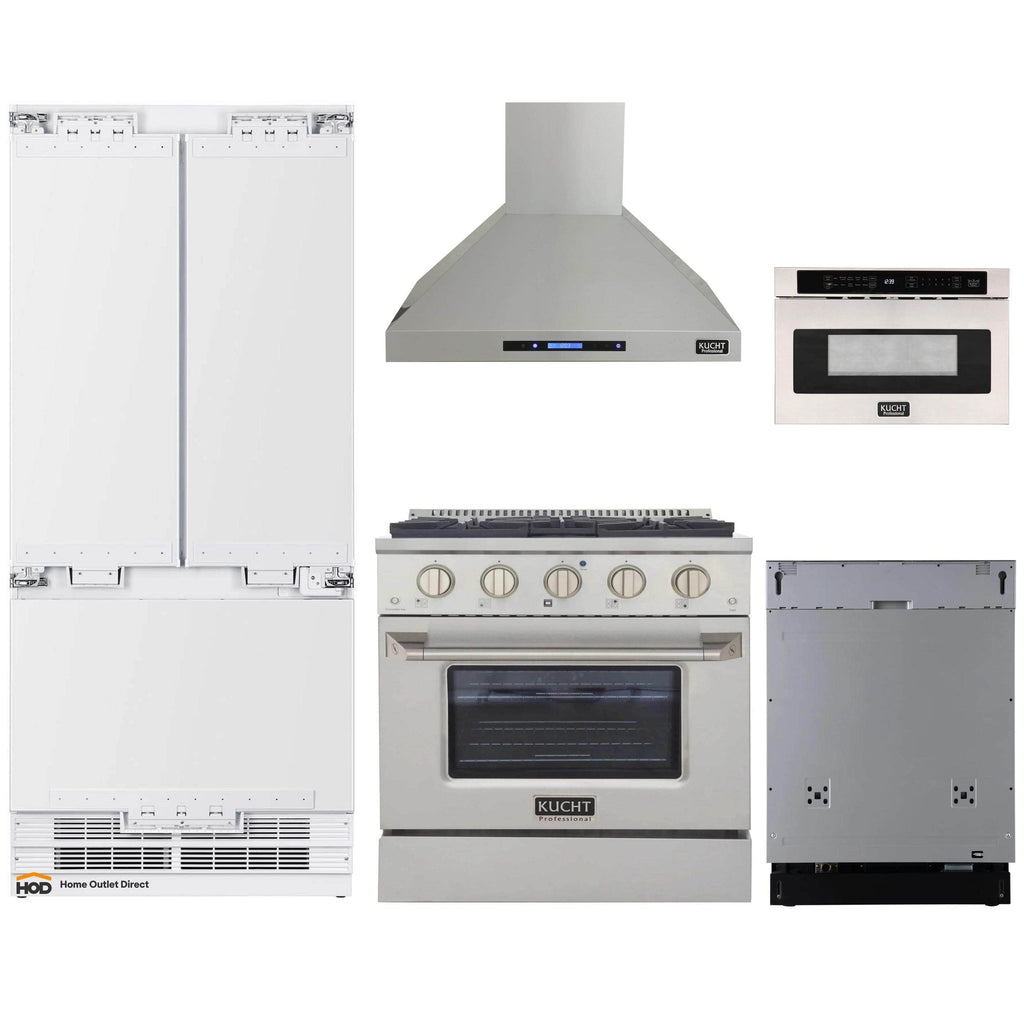 Kucht 5-Piece Appliance Package - 30" Dual Fuel Range, 36" Panel Ready Refrigerator, Wall Mount Hood, Panel Ready Dishwasher, & Microwave Drawer