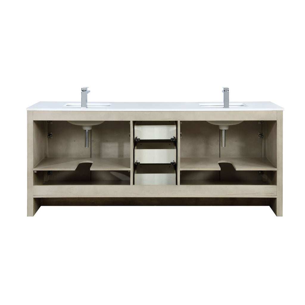 Lexora  Lafarre 80" Rustic Acacia Double Bathroom Vanity, White Quartz Top, White Square Sinks, Labaro Brushed Nickel Faucet Set, and 70" Frameless Mirror LLF80DKSODM70FBN