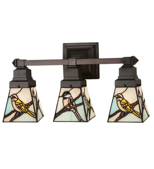 Bark Brown branches across a Azure sky make a pleasant repose for these often seen backyard bird early morning visitors on each of three art glass shades. A Meyda original design, handcrafted utilizing the copperfoil construction process using authentic art glass, the shade is complemented with hardware in a Mahogany Bronze. Dimmable energy-efficient lamping options, as well as custom sizes, styles and colors, are available. The sconce is UL and cUL listed for damp and dry locations.