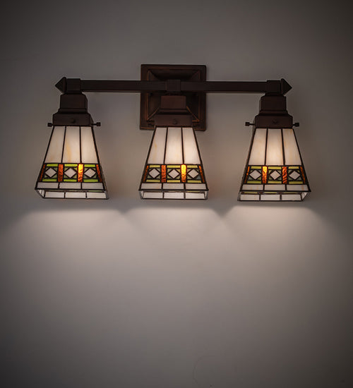 Simple clean lines and geometric shapes are the hallmark of the Mission style. This sleek Bisque Beige stained glass shade features a simple, elegant diamond pattern in Beige accented with Amber, Jade and Peridot borders. The Mission style three light vanity hardware in Mahogany Bronze supports shades that are handcrafted using the same technique as the Louis Comfort Tiffany Studio.